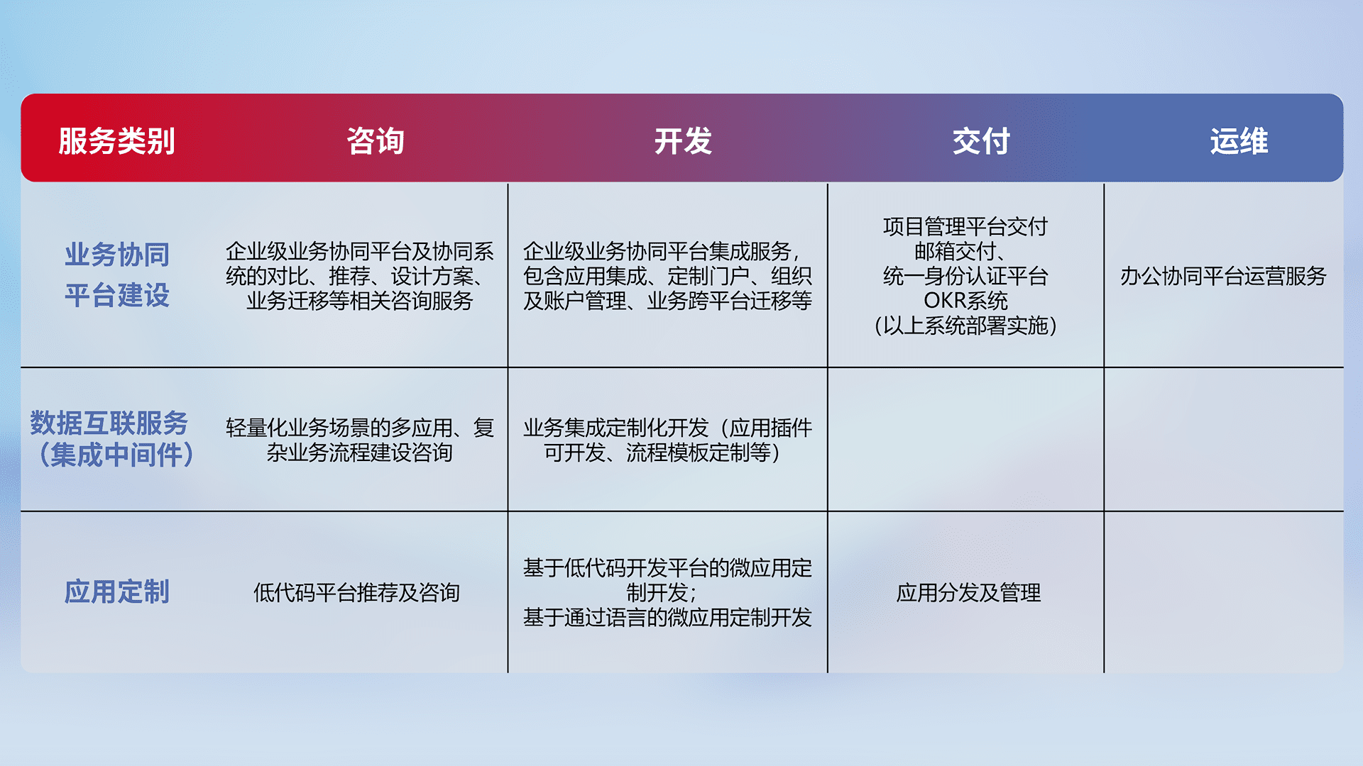 针对钉钉、、、企微、、、IDaas等平台级产品提供产品的规划、、方案、、、交付、、定制化开发等服务,,实现如统一协同办公、、智能客户服务、、混合会议管理、、智能数据查询、、、、等业务场景,,,,实现数字化转型。。
